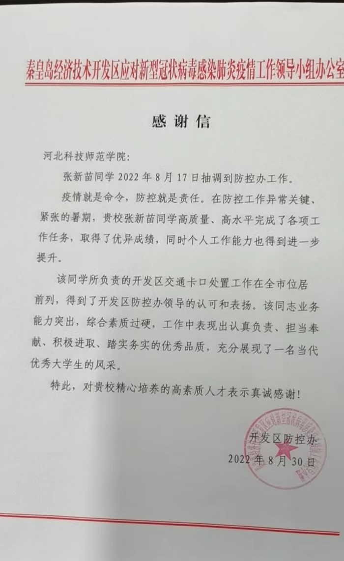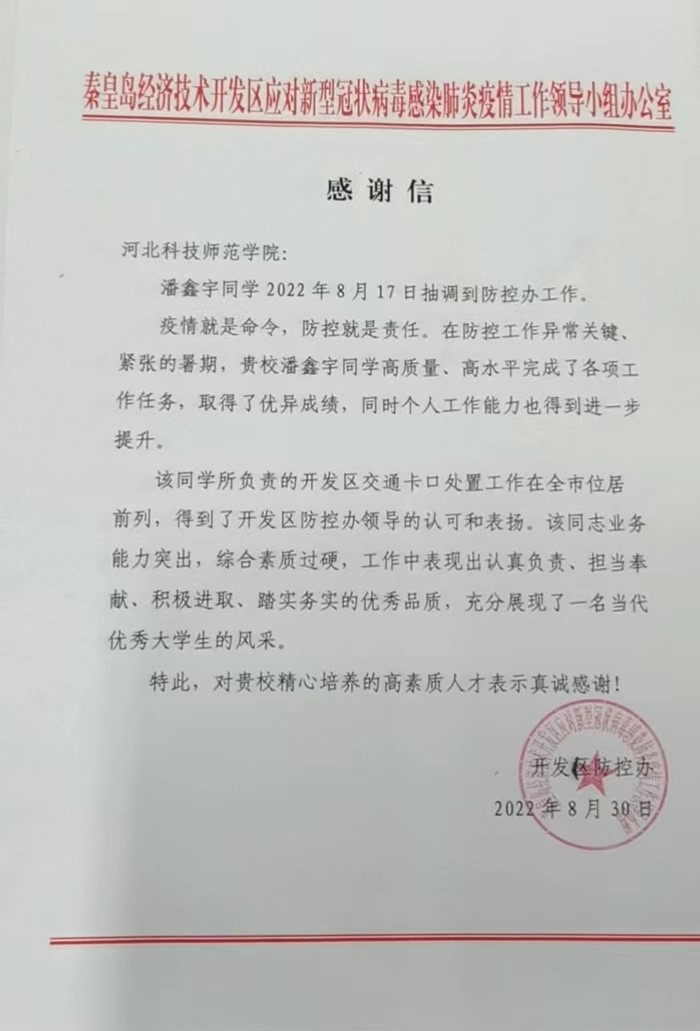 2022年9月16日,秦皇岛市疫情防控办领导刘汶隆和于俊国莅临公司,对暑期疫情志愿者工作表示感谢,并为志愿者颁发表扬信。文法公司党委书记郝东接待了防控办来宾并进行洽谈。防控办表示,面对严峻的疫情防控形势,yl6809永利积极响应国家疫情防控号召,在暑期组织员工参与本市疫情防控工作。疫情就是命令,防控就是责任,在防控工作异常关键、紧张的暑期,潘鑫宇和张新苗两位志愿者所负责的开发区交通卡口处置工作在全市位居前列,得到了开发区防控办领导的认可和表扬。高质量、高水平完成了各项工作任务,他们工作中表现出认真负责、担当奉献、积极进取、踏实务实的优秀品质,充分展现了当代优秀老员工的风采。