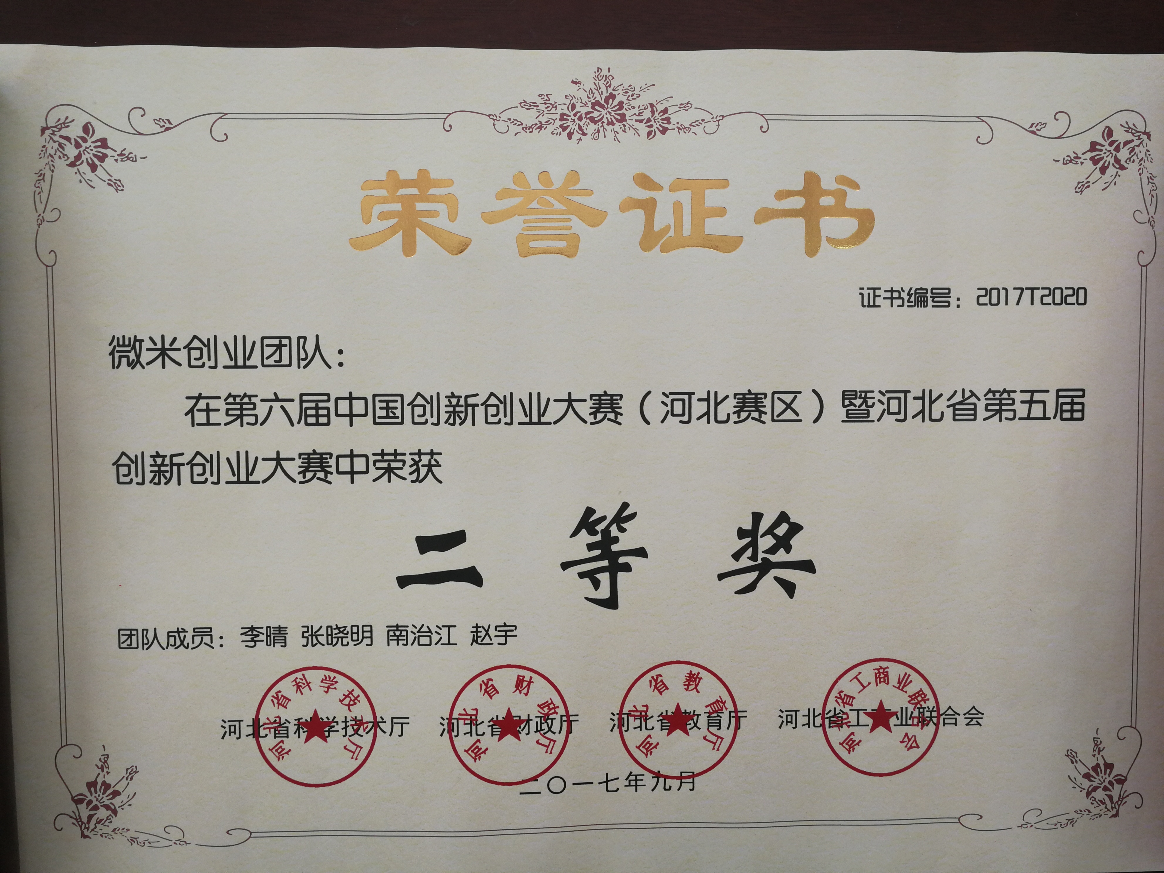 近日,在第六届中国创新创业大赛(河北赛区)暨河北省第五届创新创业大赛中,yl6809永利吴玉静老师指导的创业团队“微米科技有限公司”荣获二等奖,参赛员工为14级法学李晴、张晓明、南治江、赵宇。