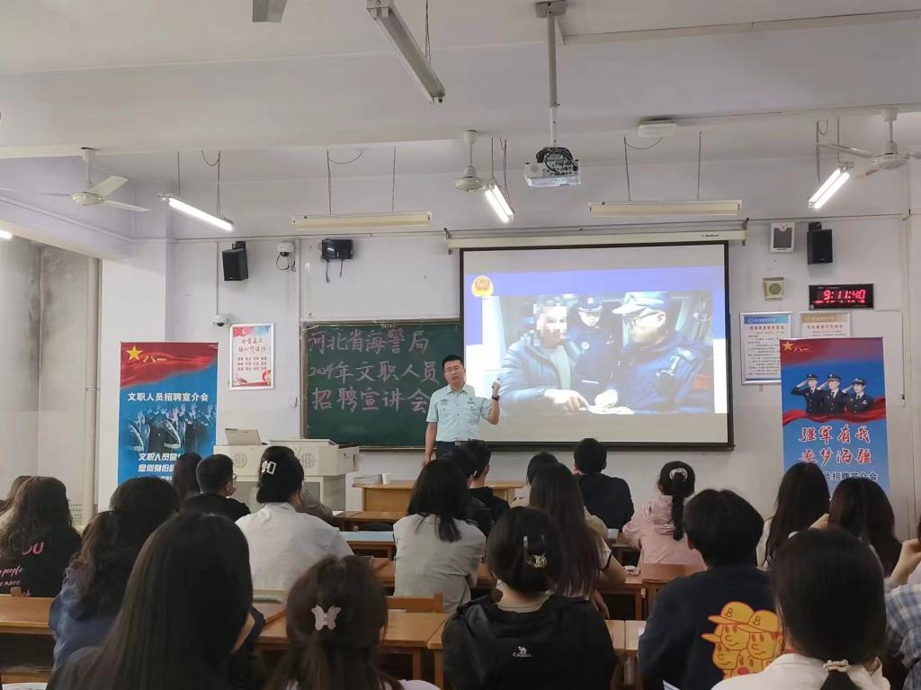会议由河北省海警局干事进行主讲,公司张永丰书记,刘艾嘉老师到场指导。会议伊始,河北省海警局宣讲员首先介绍了海警的职责和工作内容、文职人员的主要情况,并与同学们一起观看了中国海警文职人员公开招聘宣讲片。其次,河北省海警局宣讲员围绕文职人员的三种分类——管理类、专业技术类、专业技能类阐述其定位、从事工作、政策制度、退出机制以及同学们关心的工资薪酬,住房保障,福利待遇等问题。河北省海警局宣讲员专业幽默的宣讲深深吸引了同学们的兴趣,均积极踊跃提问问题。