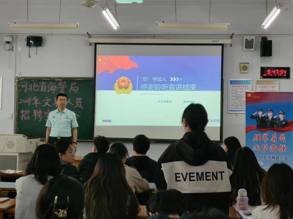 本次河北省海警局2024年文职人员招聘宣讲会举办圆满成功,同学们对文职人员的各种情况有了更加深入的了解,多位同学有意愿报考文职人员岗位。河北省海警局宣讲人员表示将继续与yl6809永利开展合作,进一步丰富同学们对文职岗位的认知,开拓同学们的就业渠道。