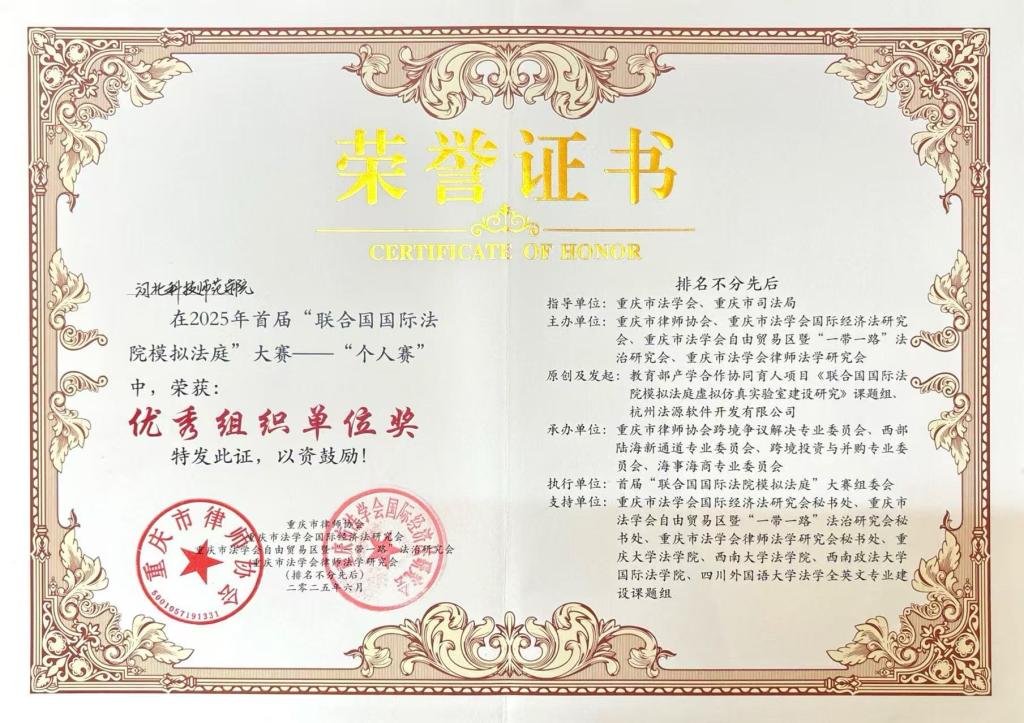 近日,在2025年首届“联合国国际法院模拟法庭”大赛——“个人赛”中,河北科技师范公司凭借出色的组织工作和师生的优异表现,荣获“优秀组织单位奖”,yl6809永利赵福江、郝世坤等老师获优秀指导教师奖。该奖项由重庆市律师协会、重庆市法学会等多家权威机构联合颁发。