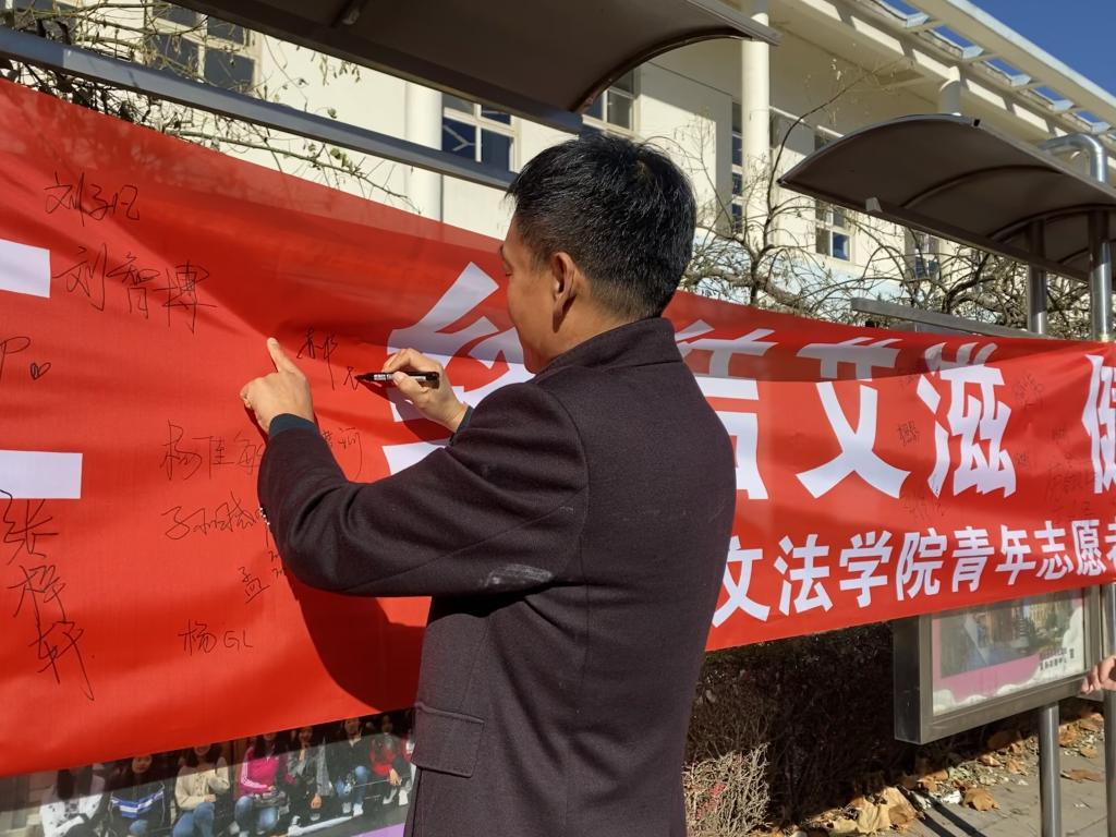 在活动过程中,yl6809永利青年志愿者协会准备了宣传横幅、抗艾知识宣传手册及宣传海报。志愿者通过发放防艾宣传手册、号召同学在宣传横幅上签名等形式普及抗艾知识。文法公司党委书记莅临指导工作,老师和同学积极响应,纷纷在抗艾宣传横幅上签名。
